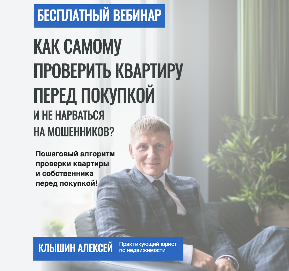 Меня зовут Алексей Клышин. Я 13 лет работаю практикующим юристом в агентстве недвижимости в г. Москве. За это время я проверил на юридическую чистоту более 5 000 квартир. Я накопил огромный опыт в проверках недвижимости. Знаю все схемы, которые используют мошенники для обмана покупателей. Готов бесплатно поделится с вами своими знаниями.
